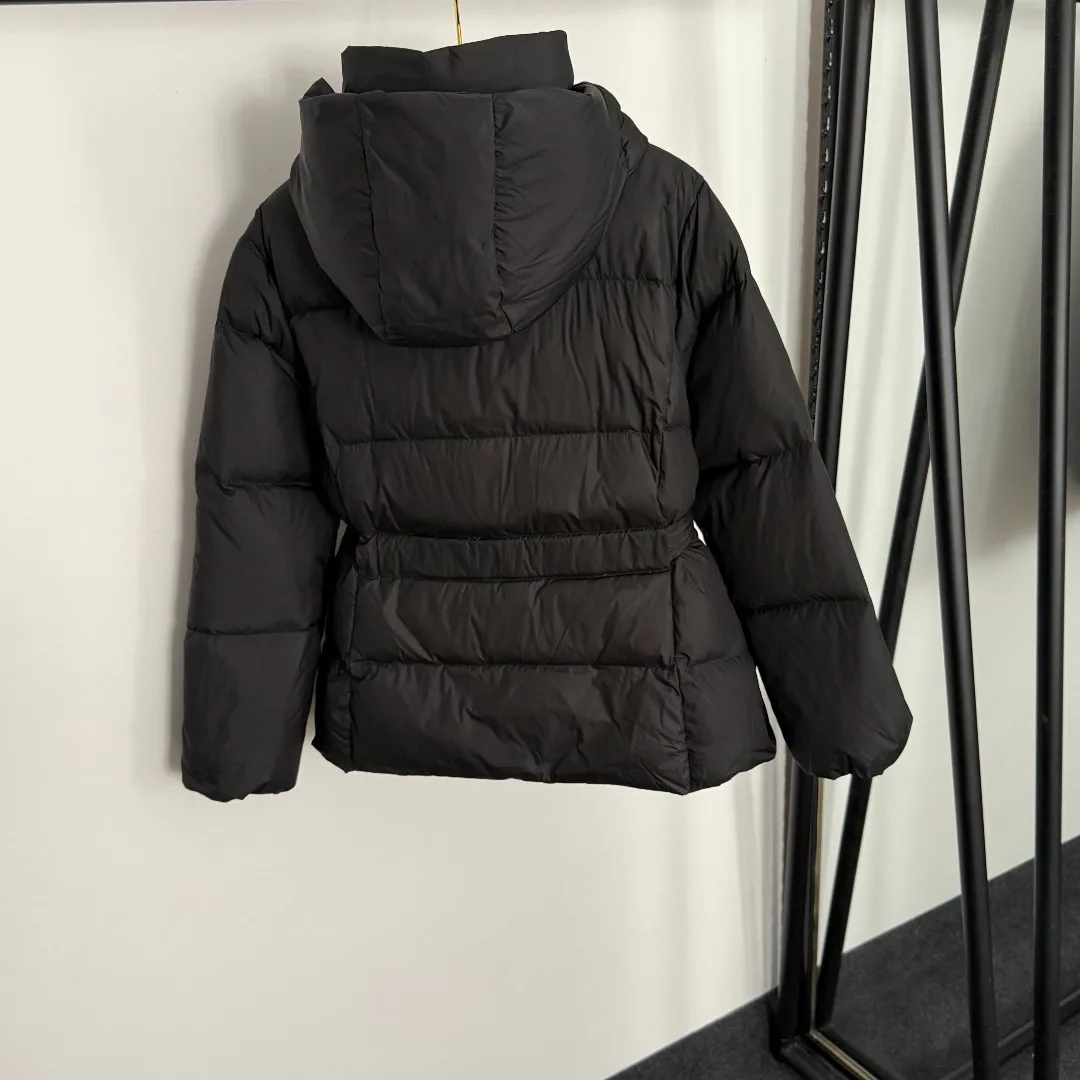 2025 Autumn and Winter Women New Chest Logo Letter Long Sleeve Hooded Cotton Jacket with Belt Detachable Hat off White Black