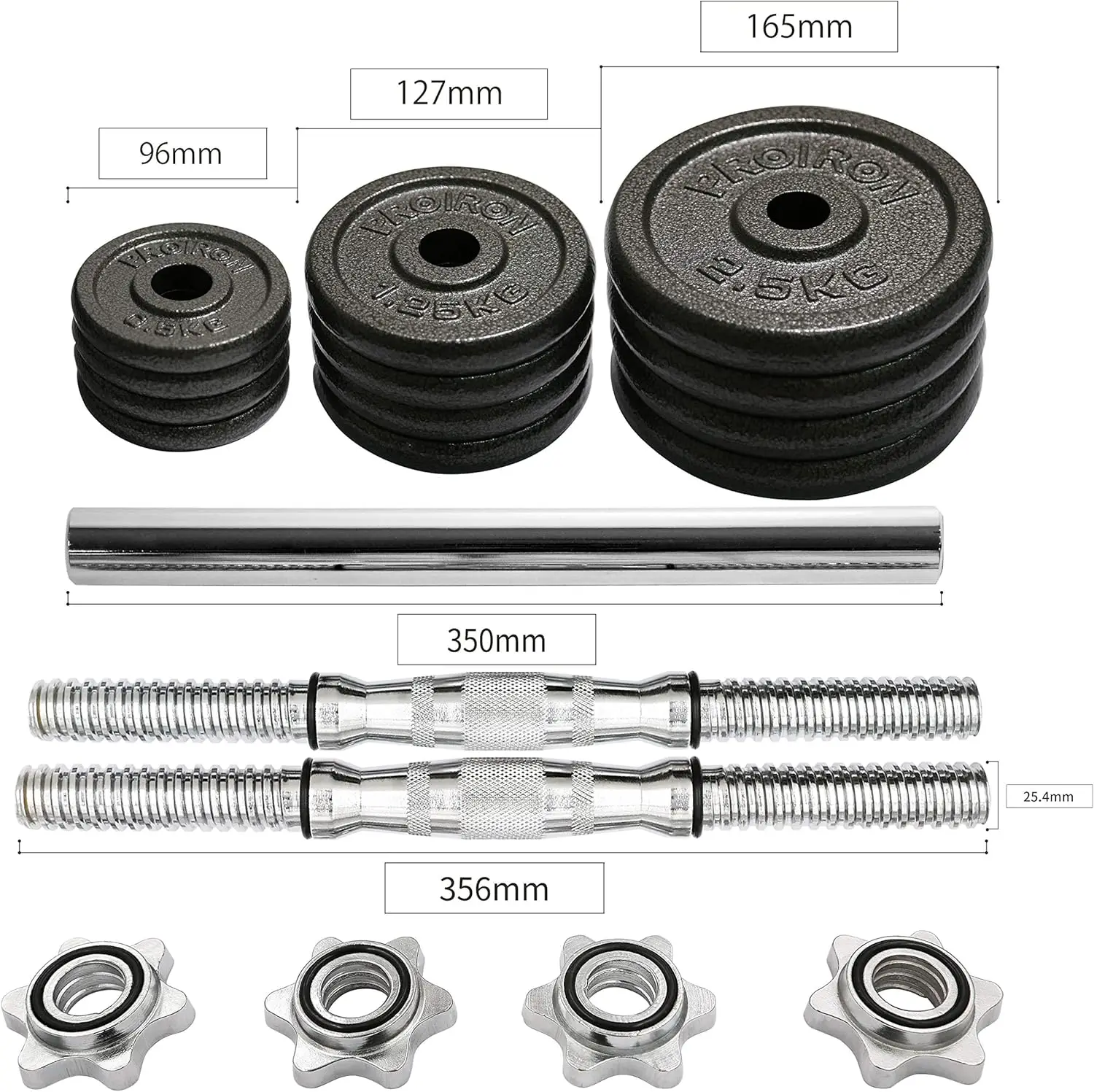 The dumbbell set includes two handles, four 0.5kg plates, four 1.25kg plates, four 2.5kg plates, 4 collars, and a extended bar.
