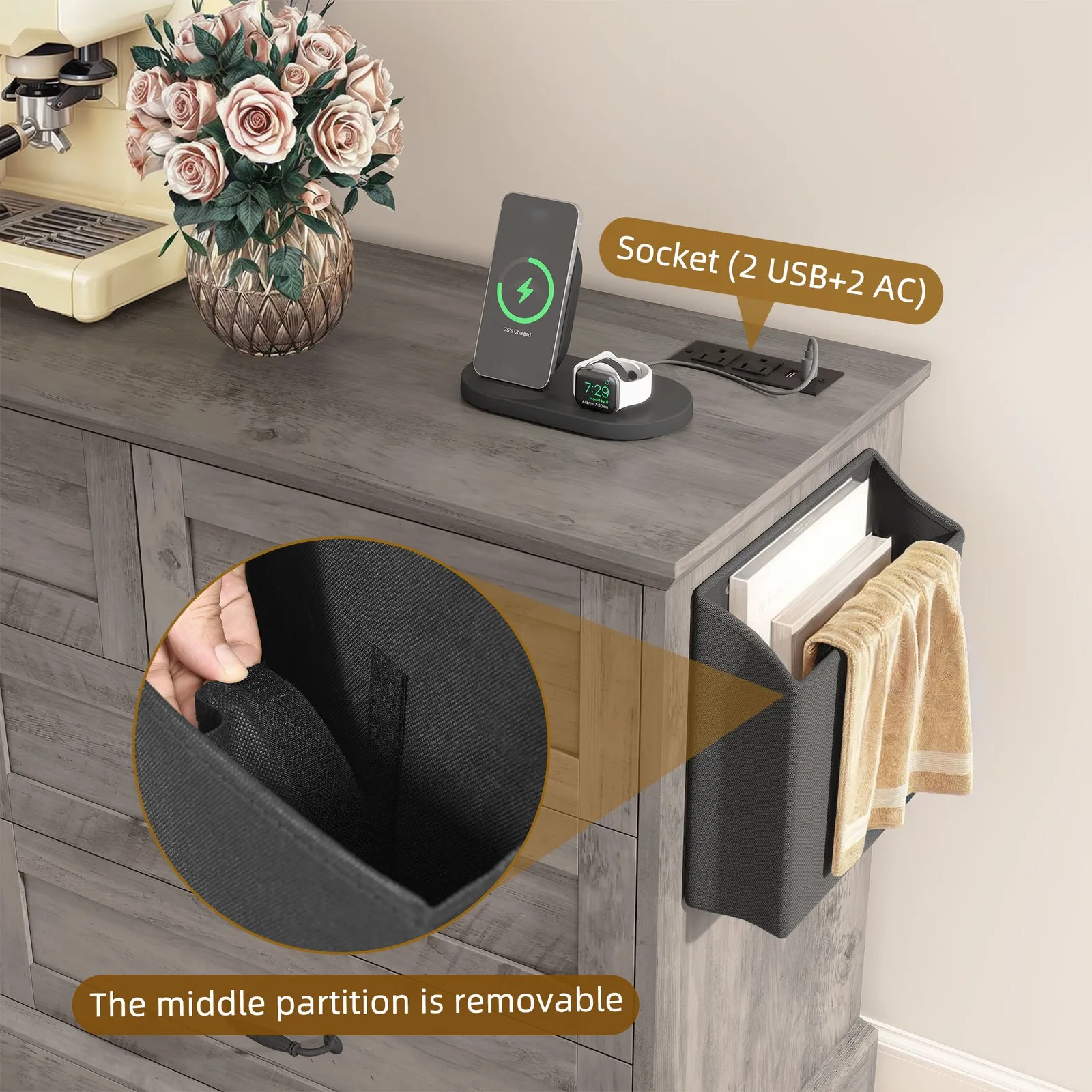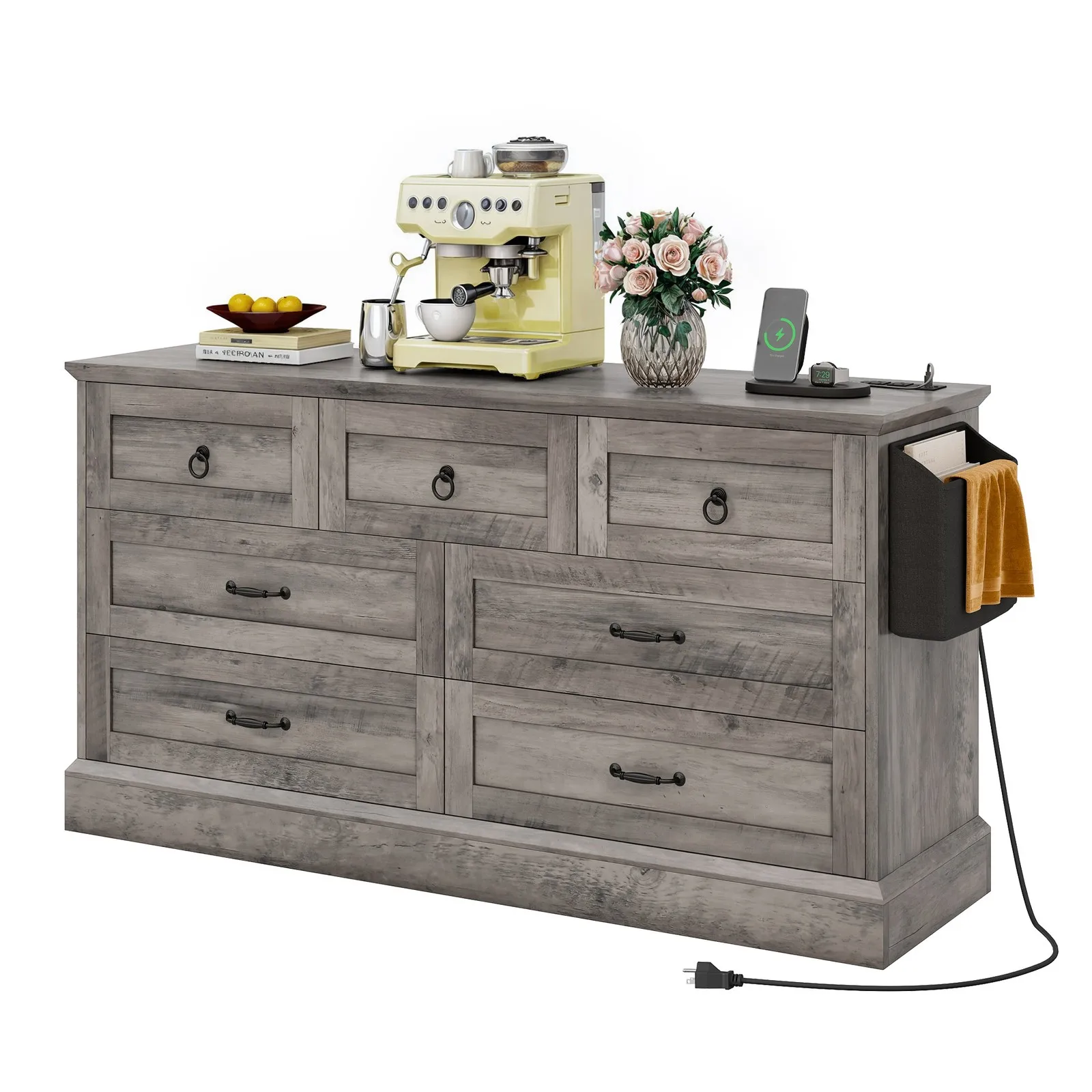 7-Drawer Farmhouse Modern Dresser – Charging Station & Stylish Storage