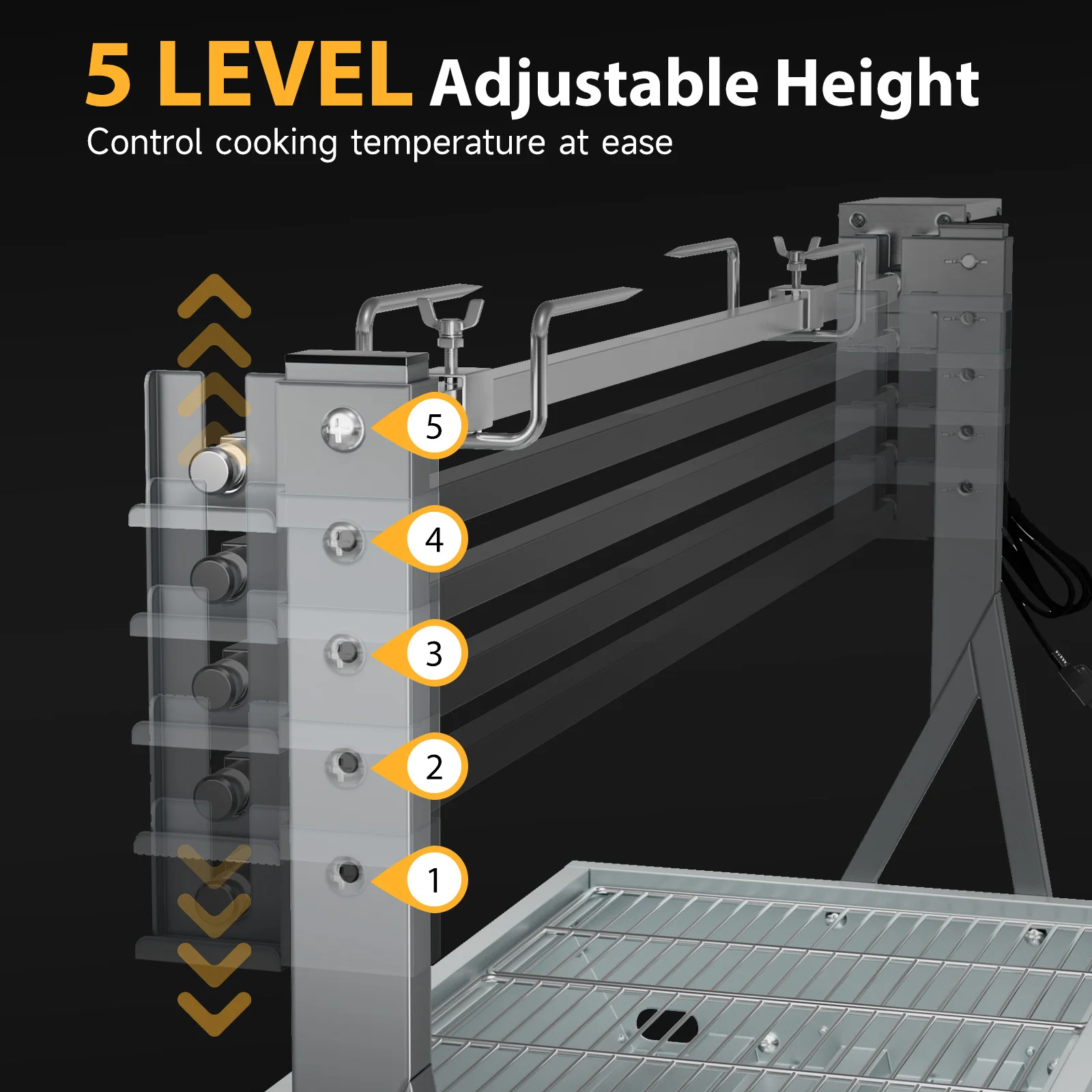 The upgraded 25W motor ensures slow, even roasting (6 RPM) for juicy, tender meat. Pair it with four-level height adjustment (4.5”–14”) to control heat intensity and cooking speed.
