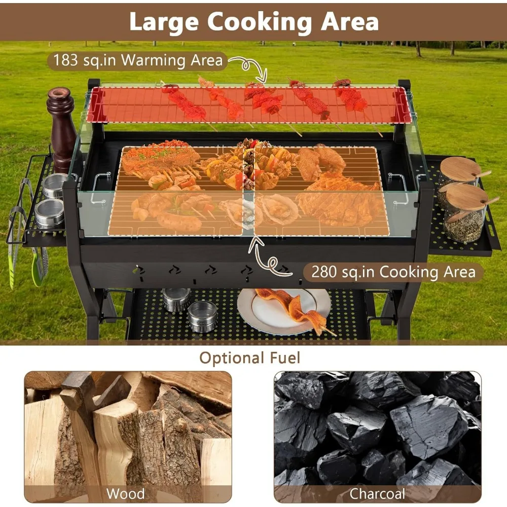 Charcoal Grill with Glass Wind Guard, Outdoor Barbecue Charcoal Grills with Seasoning Racks & Storage Shelf, Warming and Cookin
