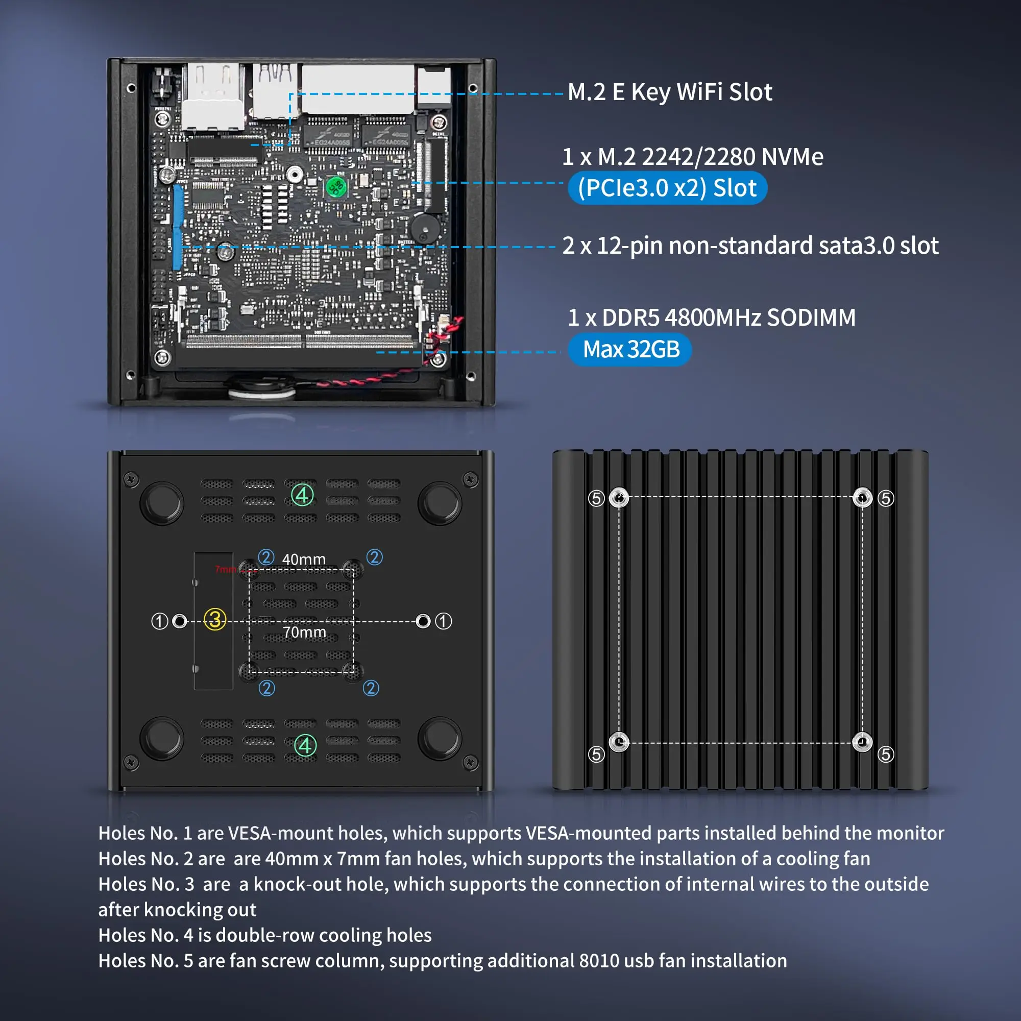 DDR5 RAM + M.2 NVMe SSD: 1 x DDR5 SO-DIMM 4800MHz RAM slot, up to 32GB of memory. With 1 x M.2 slots (PCIe3.0 x2) for 2280/2242 size NVMe SSDs, it also offers 2 x 12-pin non-standard SATA3.0 ports for SATA SSD/HDD installation, which can be connected externally via adapter cables