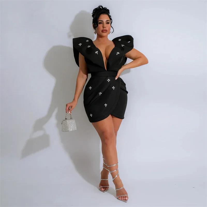 Deep V Neck Back Open Sexy Bodycon Rhinestone Women Party Dress Flying Sleeve ruched Irregular Mini Night Club Dress Black White