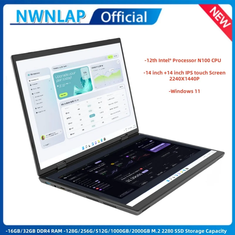 Dual Screen Laptop 14+14 Inch 2K Touch Screen Notebook 16GB Intel N100 CPU 360 Degree Flip Metal Case 2 in 1 Laptop Computer