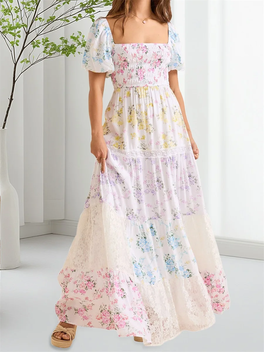Floral print, square neckline, bubble short sleeves, ruffled hemline, A-line and ankle length design; Casual dress with sleeves; Elegant dress for women, highlighting feminine charm