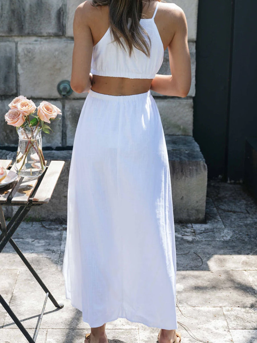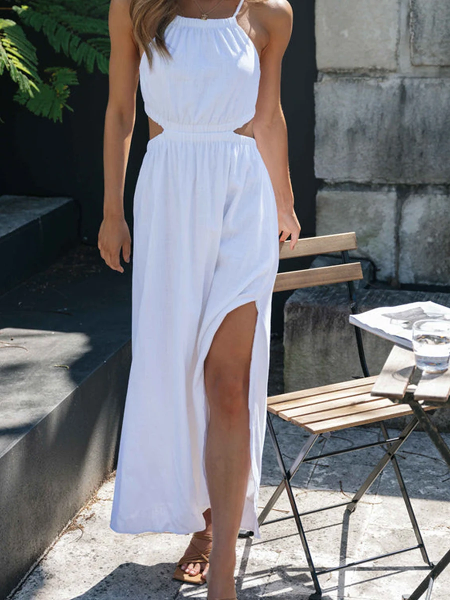 Women’s Summer Casual Long Dress Solid Color Sleeveless High Split Hollow Waist Party Dress