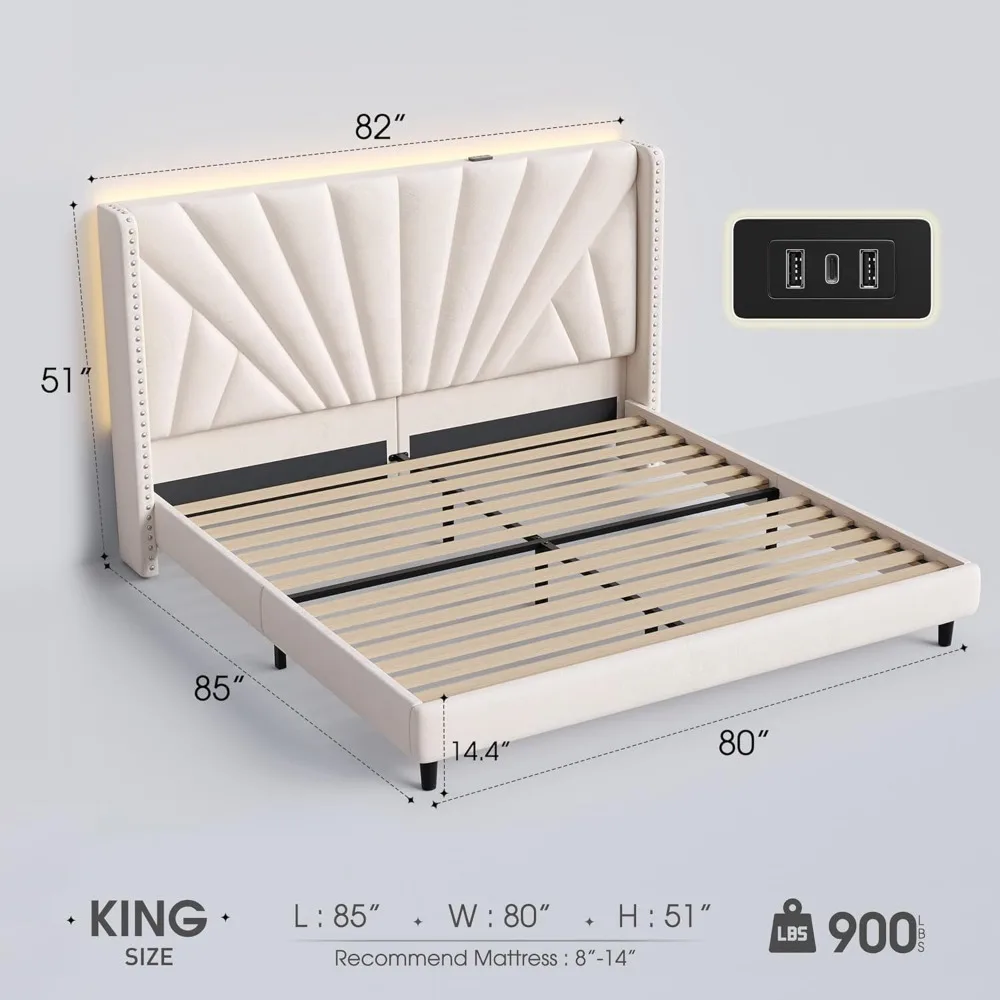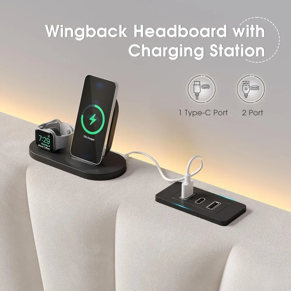【King Size Bed Frame Tall Headboard with Charging Station】The upholstered king size bed frame features 3 charging ports, allowing fast charging of multiple devices simultaneously. The built-in charging station offers convenient access, making it easy to charge your devices while creating a cozy ambiance.