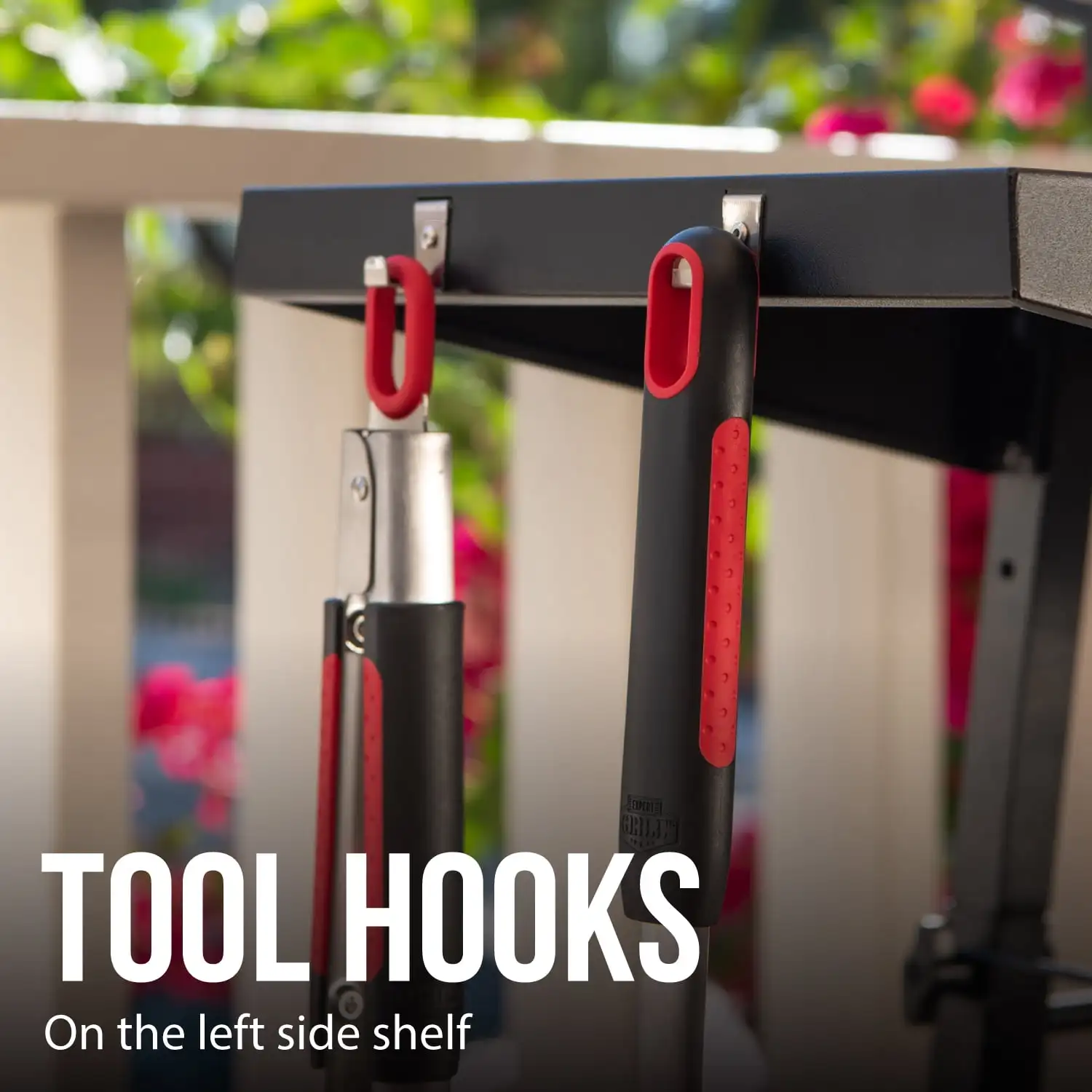 Two fixed side shelves offer ample space for food prep, plus attached hooks on the left are perfect for storing grill tools.