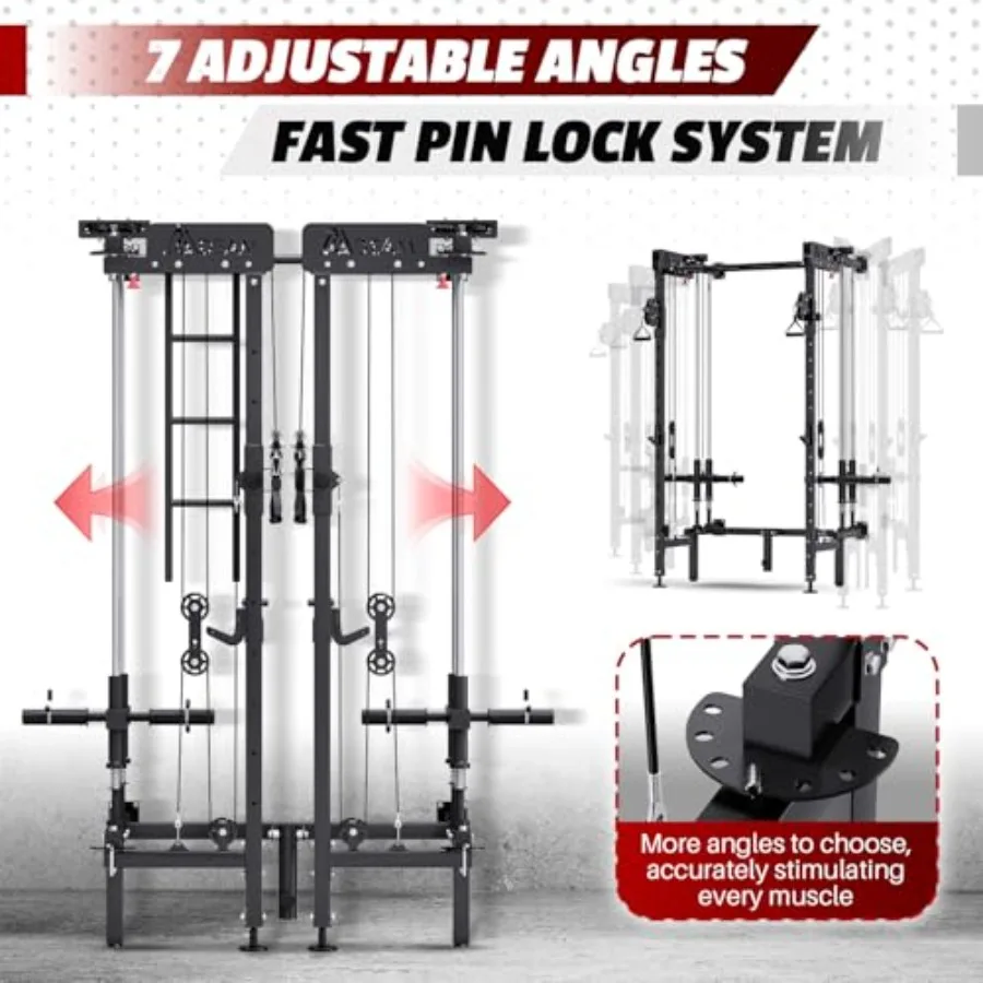 MULTIFUNCTIONAL FOLDING SQUAT RACK:This multi-function machine seamlessly integrates a power cage, cable crossover machine, lat pull down machines, pull-up bar, and more into one sleek unit. Power rack with pulley system with seven adjustable angles, can meet you have the versatility to tackle any workout.