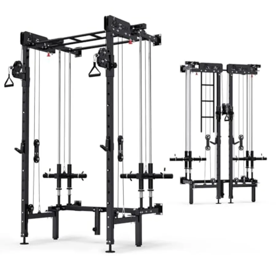 PREMIUM DUAL CABLE PULLEY SYSTEM:The foldable power rack features a dual cable pulley system with a 1:1 cable pulley ratio, allowing for smooth, independent crossover movements. This system enables simultaneous use by up to three people, making it perfect for family fitness.