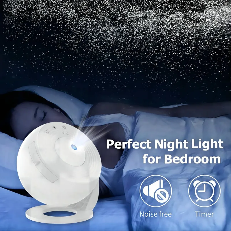 Multiple Display Modes Optional: Support independently control the Movie Lights (press the second button to turn them on/off) and Side Star Lights (press the third button to turn on/off/switch the light mode). No noise while working creates a soothing sleep environment. The fourth button can turn on/off the star rotation, and press 2 seconds for a timed shutdown (fixed for one hour).