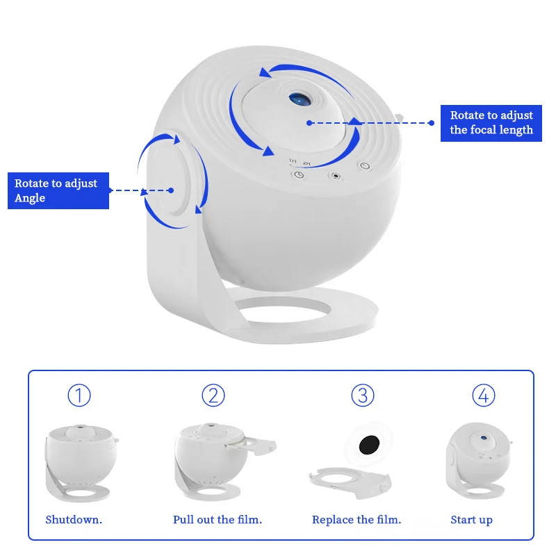 Support independently controls the Movie Lights (press the second button to turn them on/off) and Side Star Lights (press the third button to turn on/off/switch the light mode). No noise while working creates a soothing sleep environment. The fourth button can turn on/off the star rotation, and press 2 seconds for a timed shutdown (fixed for one hour).