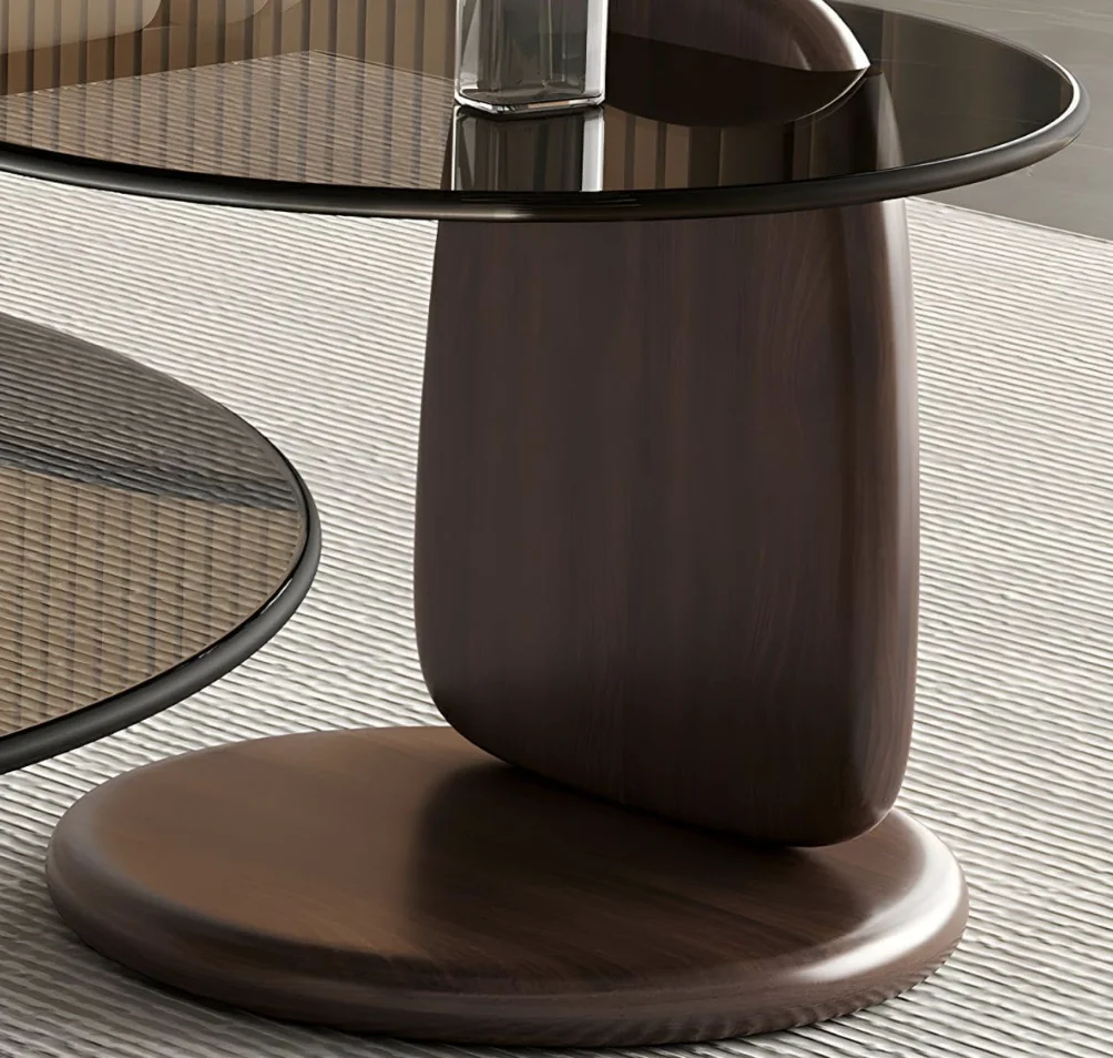 Glass Round Coffee Table Nesting Table Set of 2, Rustic Low Coffee Table Modern Center Table with Wood Base, Brown Glass Accent