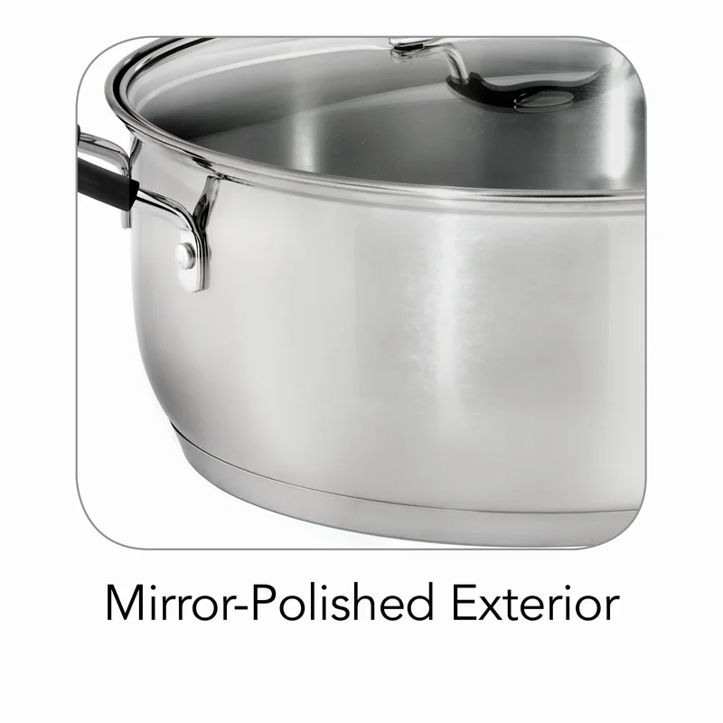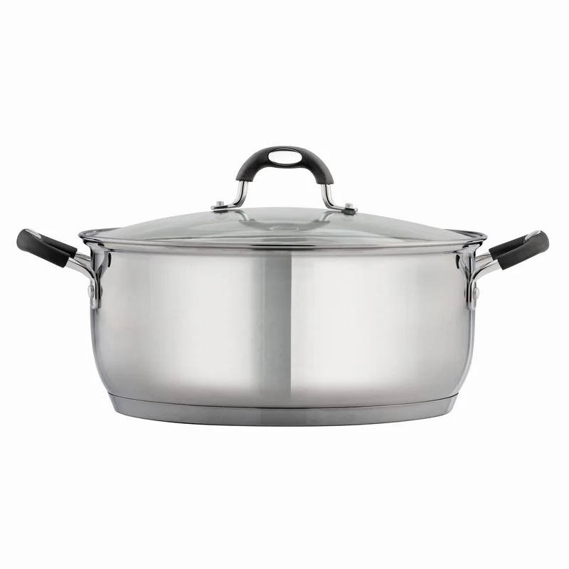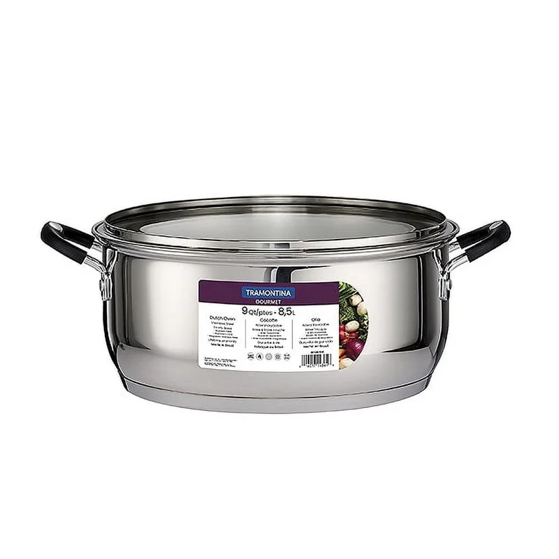 ‘s Gourmet Stainless Steel 9 Qt. Covered Dutch Oven is a must have for making large batches of soups, stews and chili, boiling seafood, or slow-cooking large cuts of meat. The induction-ready tri-ply base distributes heat quickly and evenly, while the heat- and shatter-resistant glass lid allows you to monitor your cooking progress. Ergonomically designed, riveted, soft-grip silicone handles ensure a comfortable grip and provide added support when handling a filled pot.