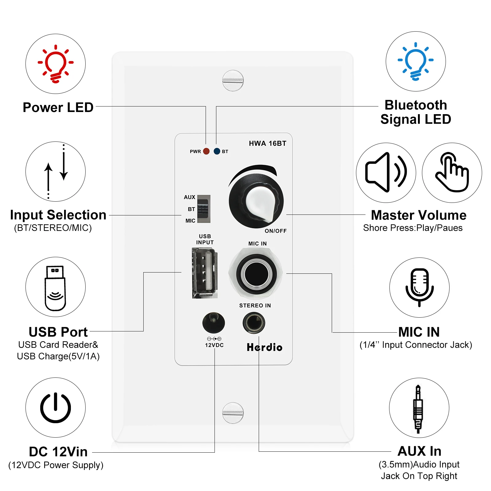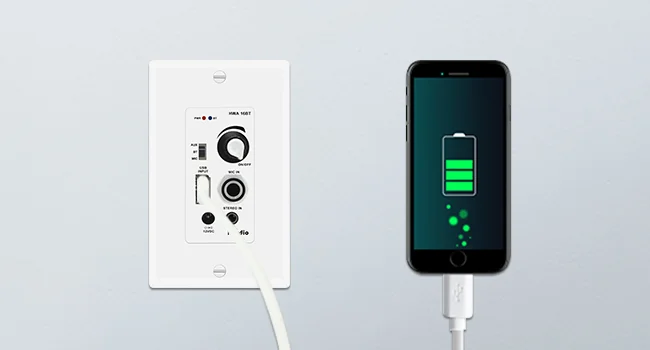 MIC IN /USB /AUX-IN: Has a USB flash memory card reader for media playback and also acts as a charging port for the device. The AUX 3.5mm audio input jack lets you connect and stream audio from external devices. The wallboard receiver adds convenient microphone paging capability as well as sample source audio control.