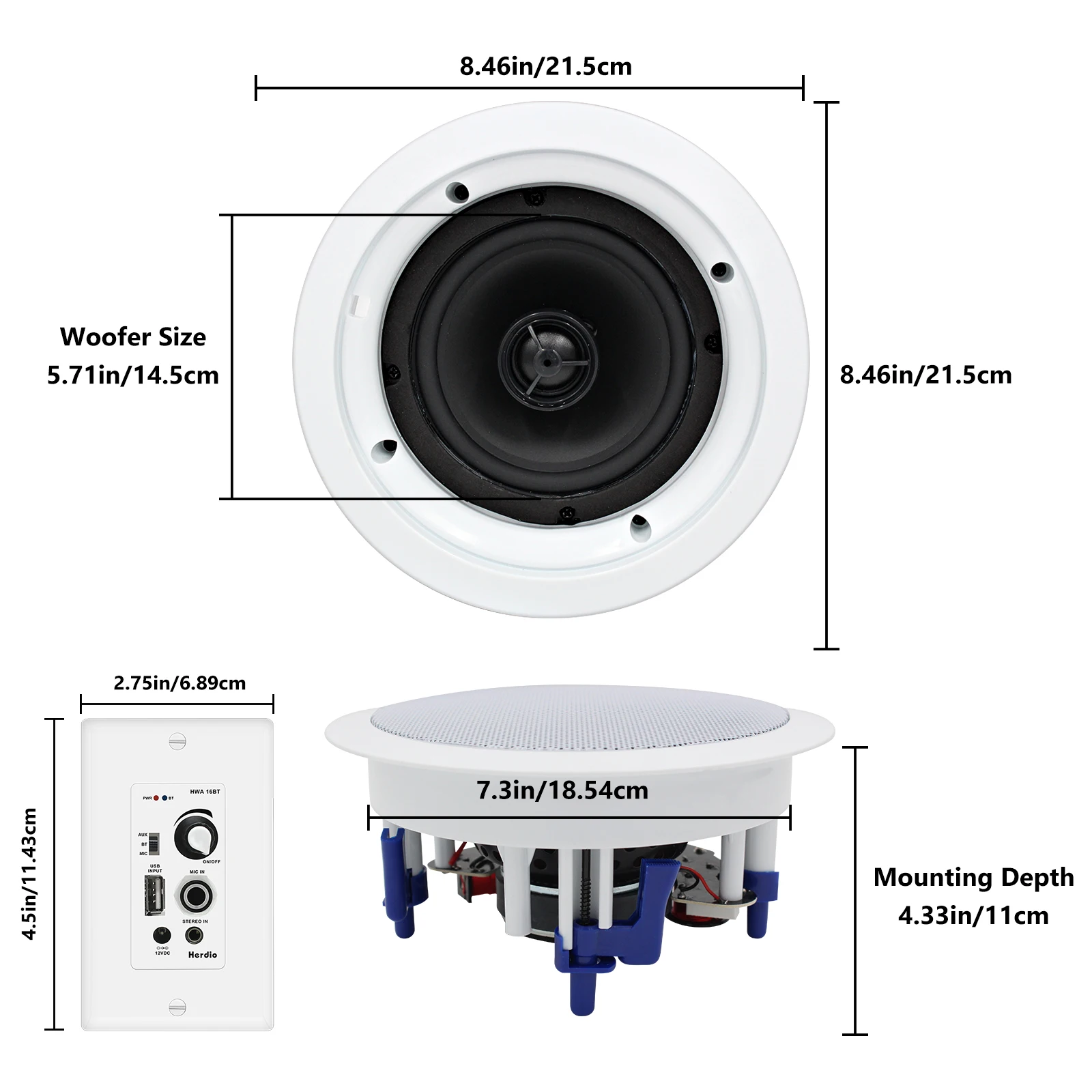 Speaker Dimensions: Overall Speaker Diameter 8.46″ (21.5cm), Opening Diameter 7.3″ (18.5cm), Speaker Depth: 4.33″ (11cm)