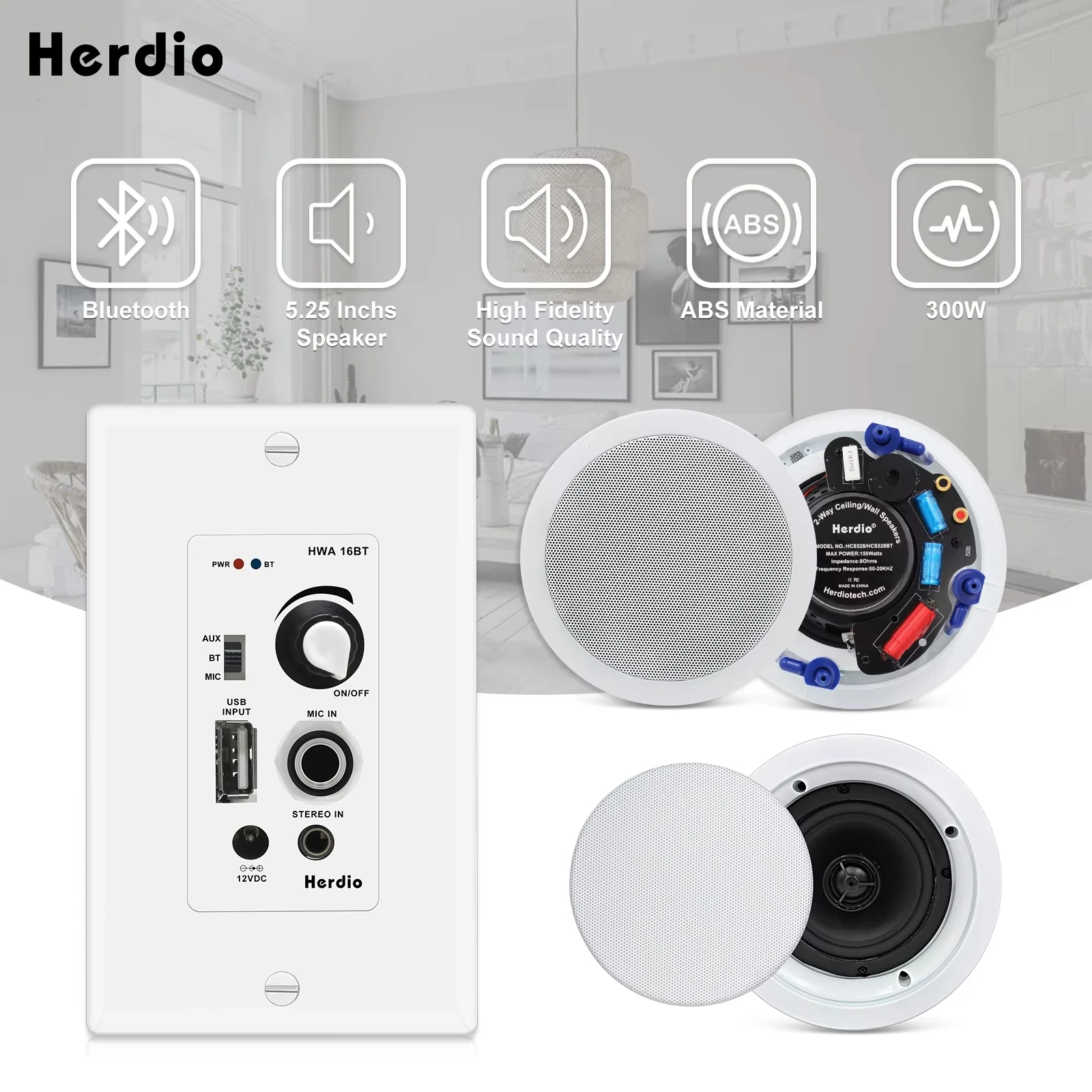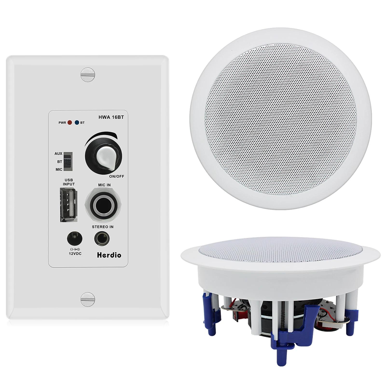 Herdio Home Audio Package Wall Mount Bluetooth Amplifier Receiver System with 300W in Ceiling Wall Passive Speakers Perfect for Home Theater Office Bathroom Kitchen Living Room (A Pair)