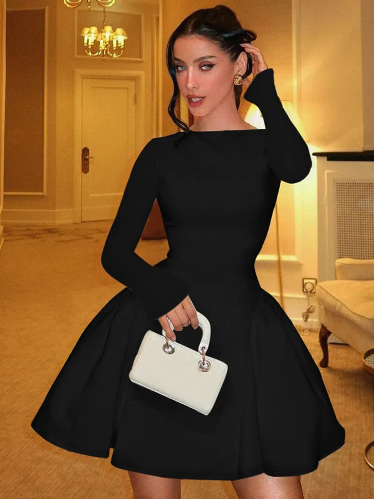 Mozision Elegant Long Sleeve Sexy Mini Dress For Women Solid O Neck High Waist A-line Bodycon Club Party Dress Clubwear New