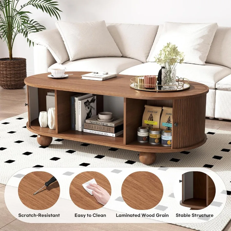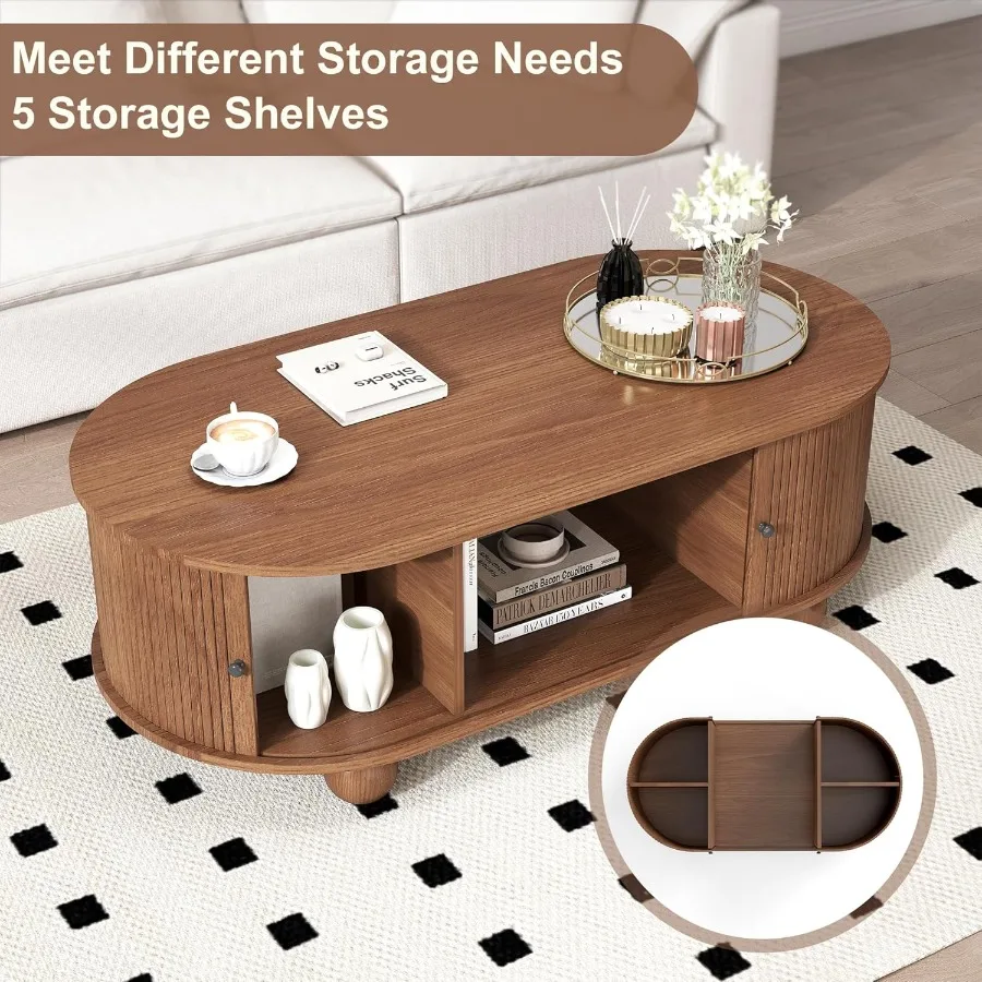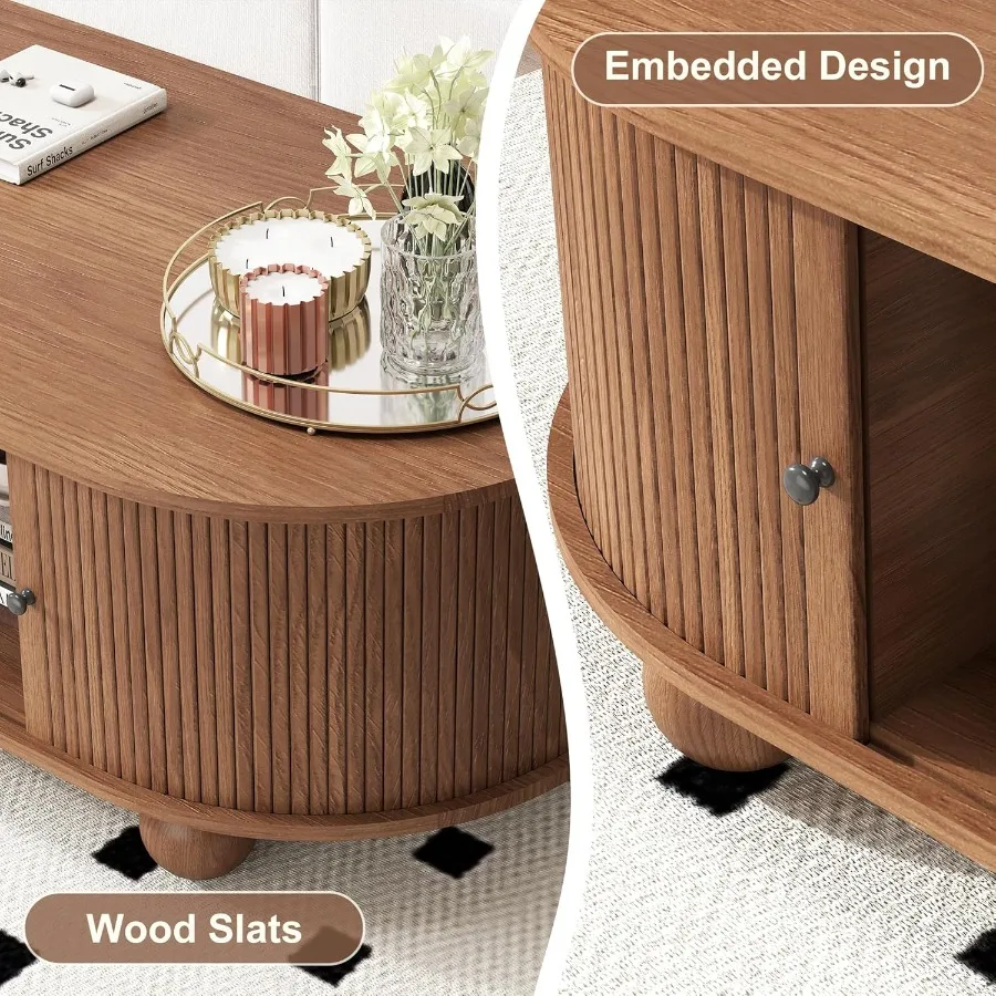 Oval Coffee Table with Storage 47.3 Mid Century Modern Coffee Tables with Sliding Tambour Doors Wood Fluted Accent Center Table