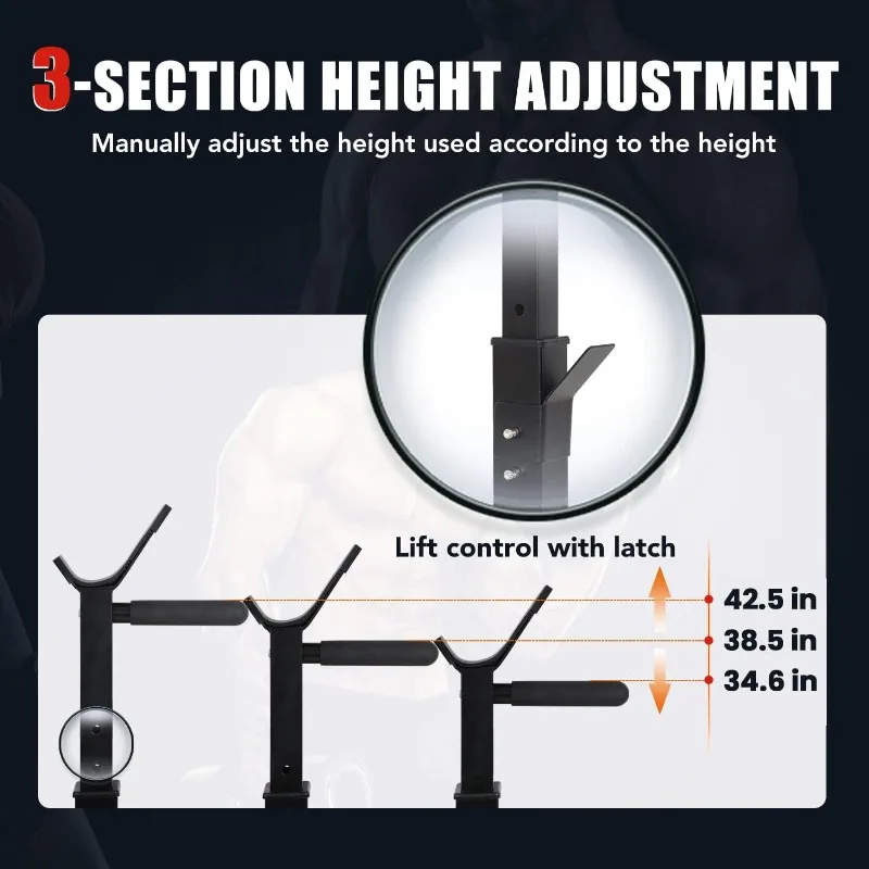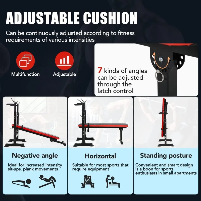 💪【Adjustable Height & Angles】The weight lifting bench has 3 different heights can be adjusted ,ranging from 34.6” to 42.5” ; 7 kinds of angles of the bench press seat cushion can be adjusted through the latch control, flat or incline,which can satisfy your different exercise demands and cater to people of different build.