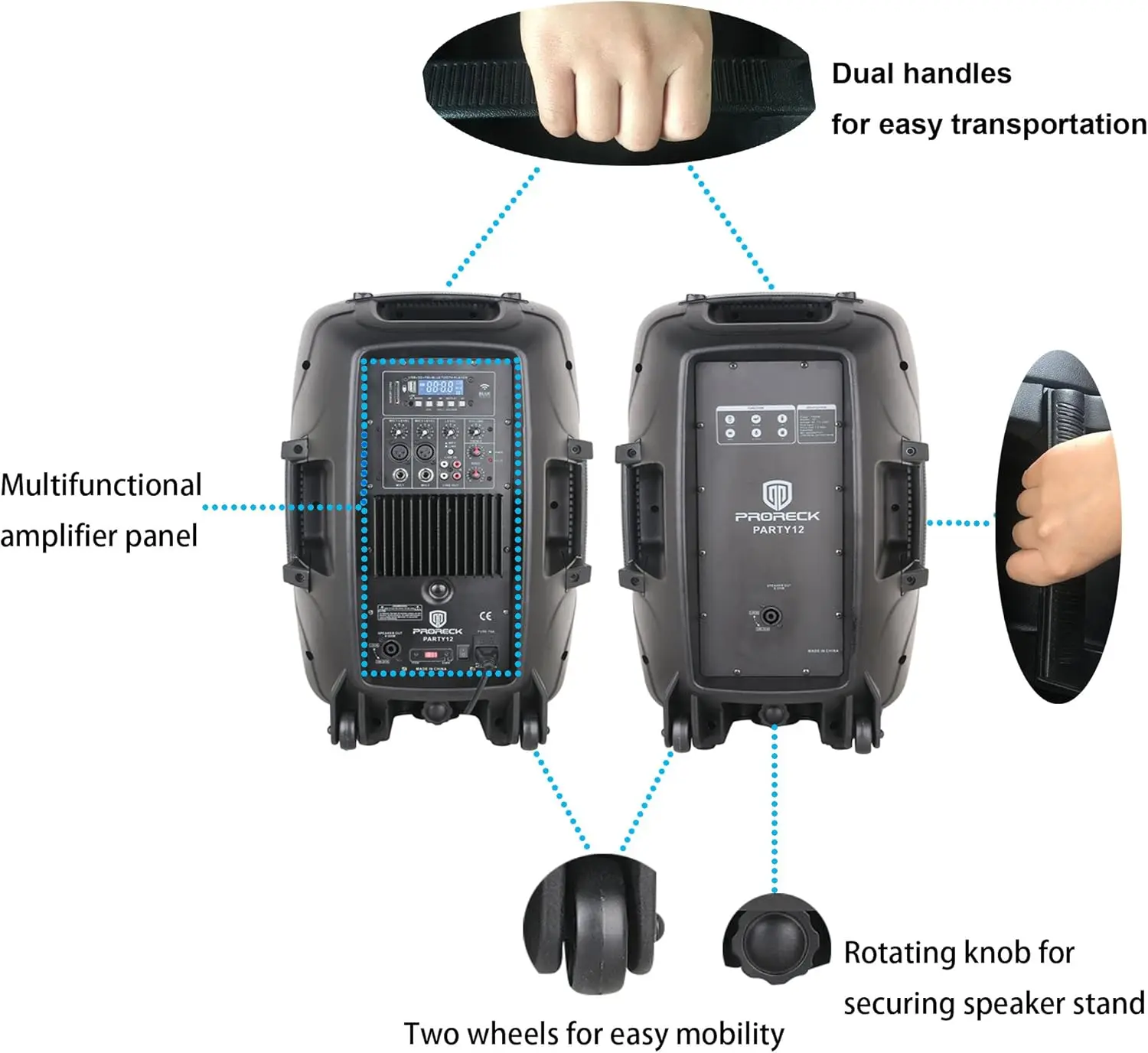 The PARTY 12 has an active speaker and a passive speaker. The active speaker has a built-in