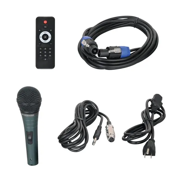 Our 9-piece PA system, with which you can easily enjoy the powerful sound, is composed of an active speaker, a passive speaker, a microphone, a wireless remote control, a 30ft