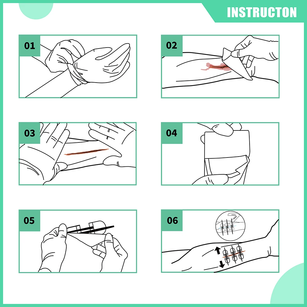 In addition to 6pcs wound closure strips, the zipstitch kit contains BZK and alcohol pads for disinfection, gauzes and bandages for wound dressing, clear waterproof dressing for wound protection,and also nitrile gloves, scissors, tape, and user guide. Undoubtedly, you can easily treat cuts with our wound care products kit.