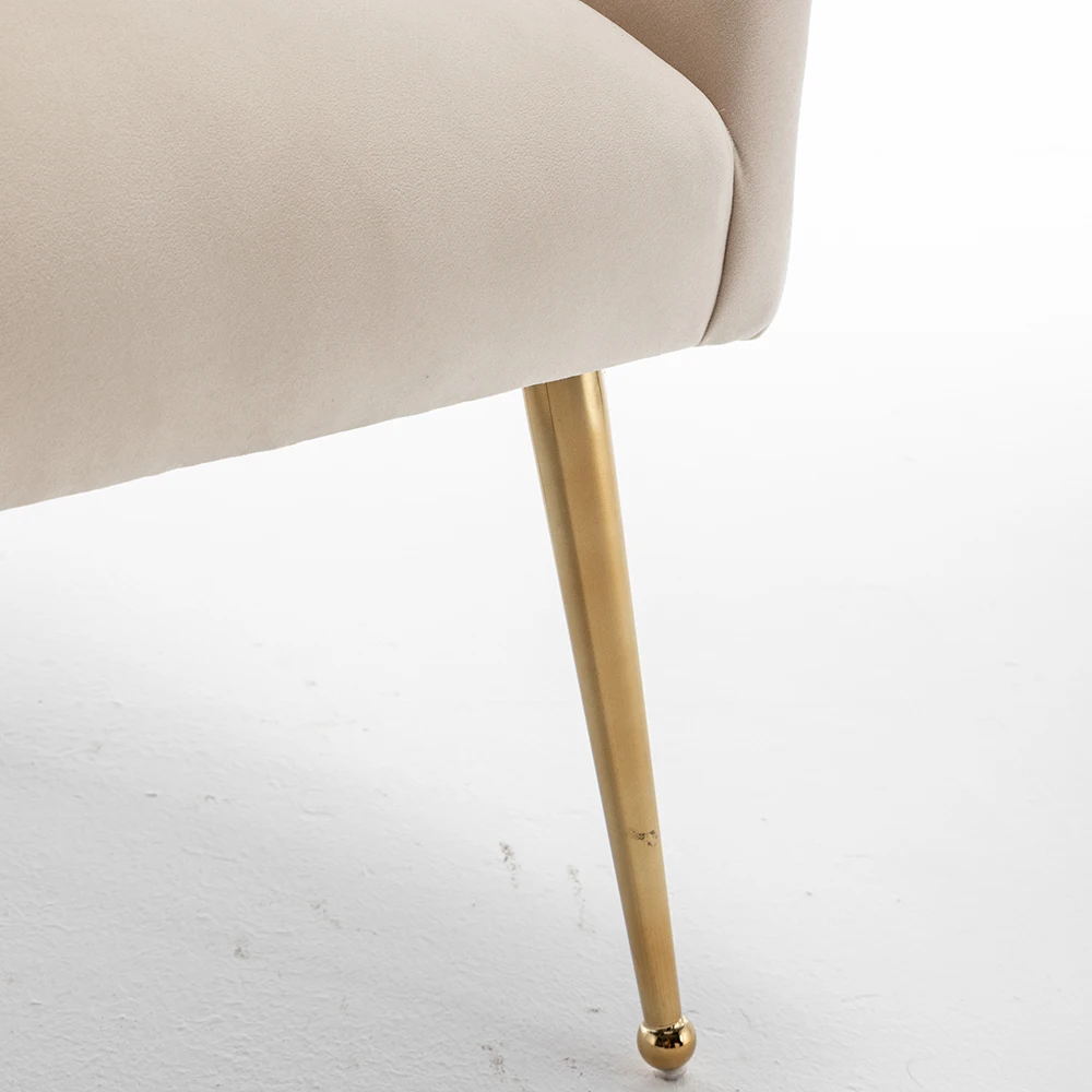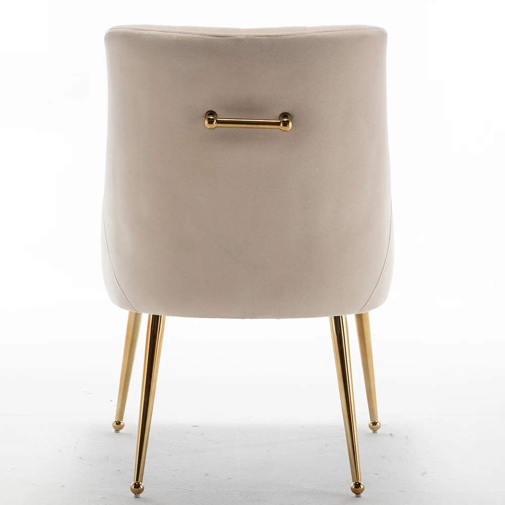 Transform your dining setting with these luxurious velvet dining chairs. Luxuriously soft and inviting, each chair features a sturdy high backrest for exceptional support, paired with durable metal legs for enduring stability. Enhanced with elegant gold back pulls, these chairs radiate a timeless charm evocative of Hollywood’s iconic glamour. Available as a set of six, they effortlessly bring a touch of elegance to your dining room, kitchen, or any space yearning for a touch of sophistication.