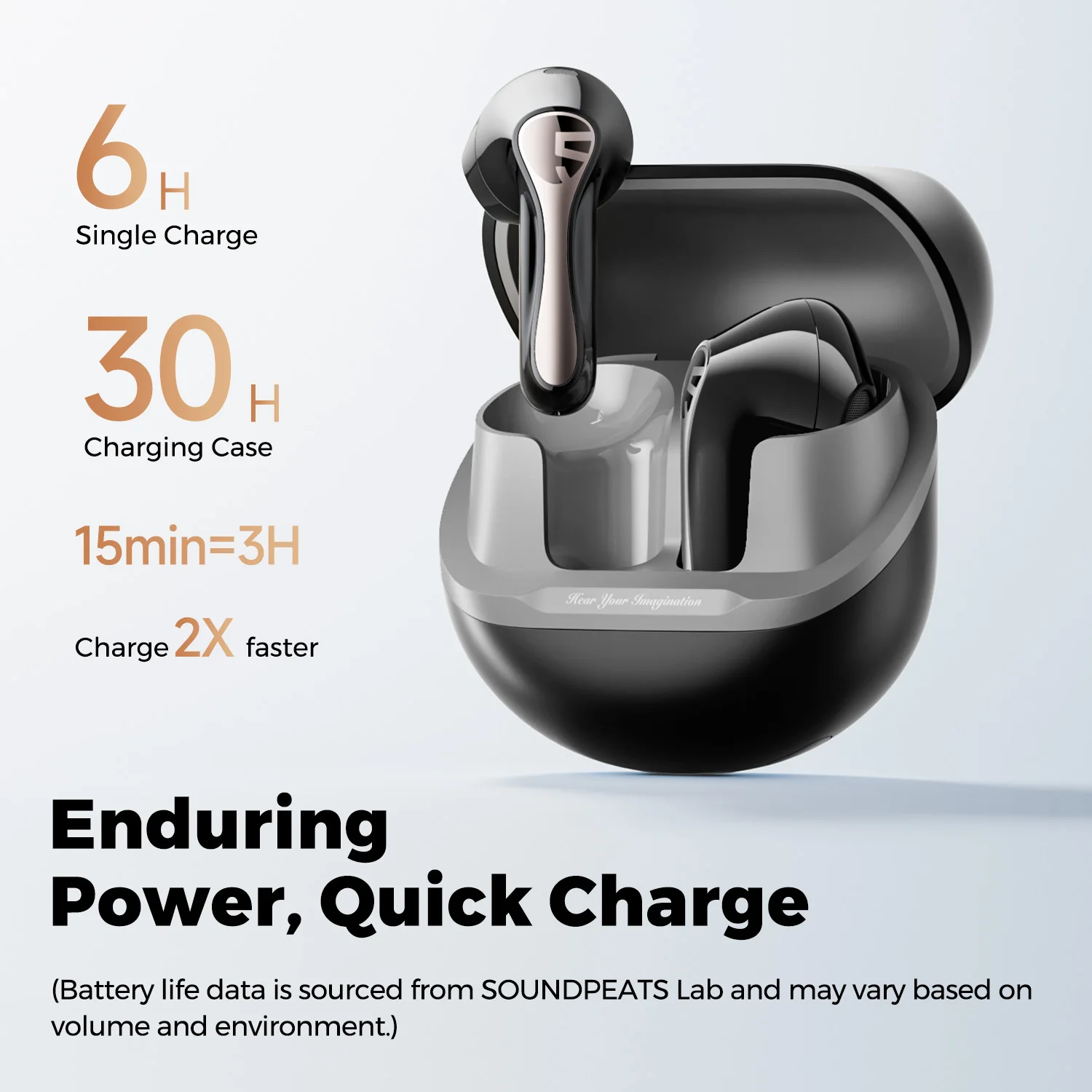 Ultra-long battery and fast charge: Long battery life: Get up to 6 hours of playtime on a single charge and up to 30 hours with the charging case, perfect for extended use. Enjoy 3 hours of playback with only 15 minutes of fast charging. (Note: Battery life data is based on SOUNDPEATS lab testing. Actual performance may vary depending on volume, environment and conditions of use)