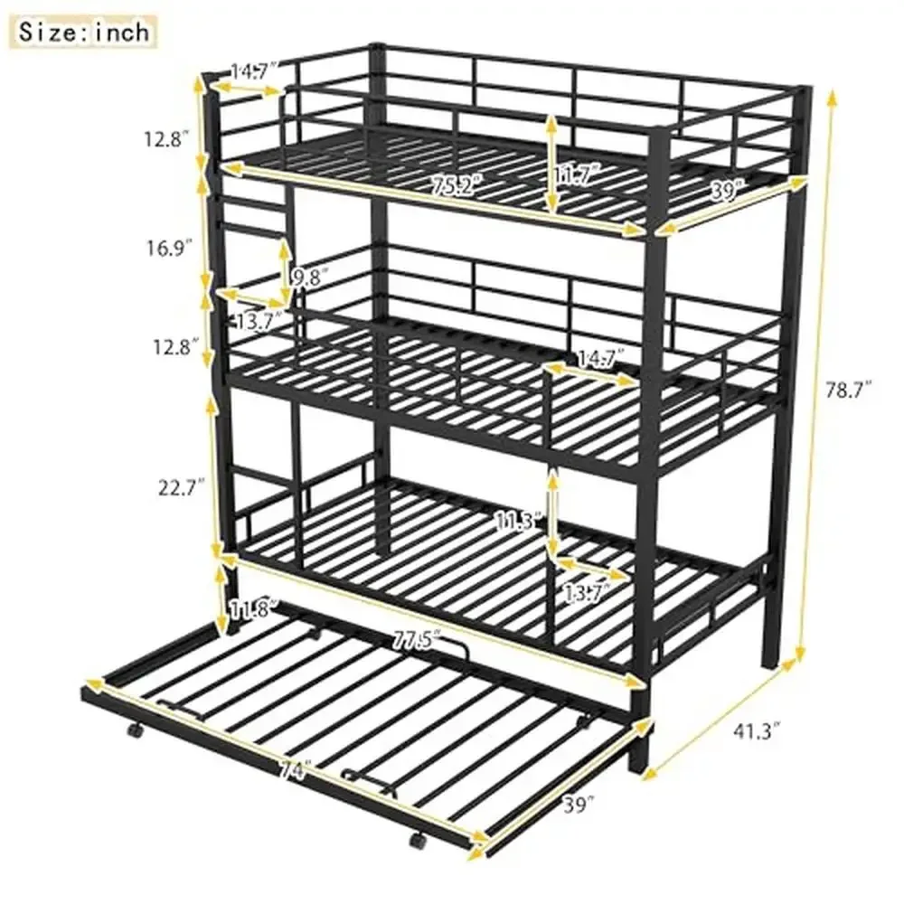 Triple Bunk Bed with Trundle Metal 3 Single Beds 2 Ladders Safety Rails Sturdy & Stylish Twin/Twin/Twin Space-Saving Design