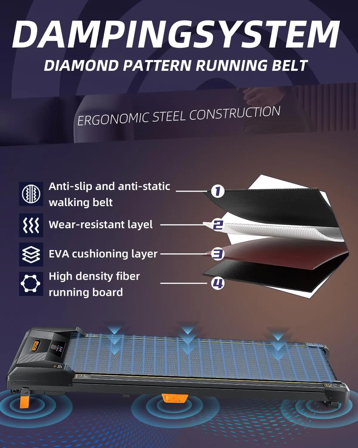 Non Slip and Shock Absorption: BestGod desk treadmill is paired with a 4 layer high-density running belt with a 16*36inch running area, the diamond threads on the surface can increase friction and effectively prevent slip. 6 shock absorbers on the bottom reduce noise and vibration, bring you a comfortable exercise and effective reduce the impact and protect your joints and knees