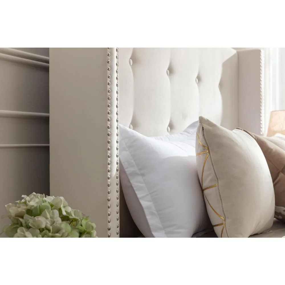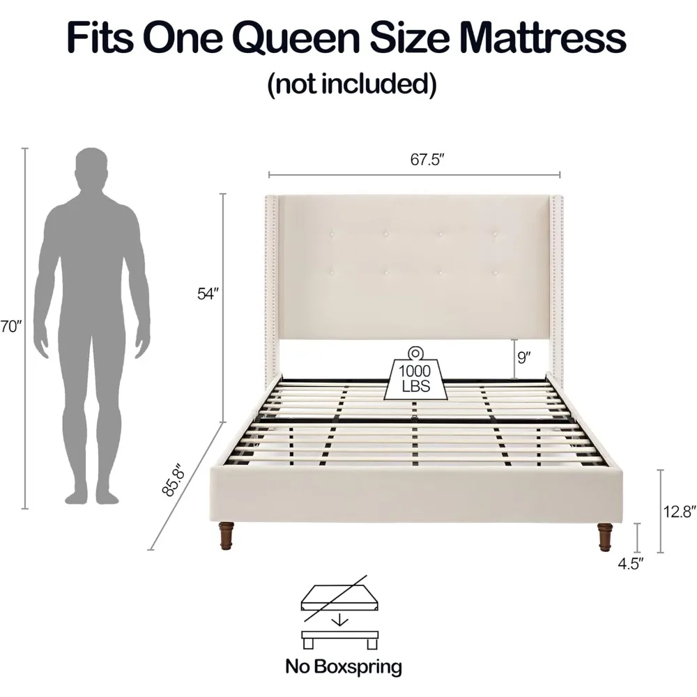 Luxurious Upholstered Bed Frame: Create the bedroom of your dreams with this stunning, upholstered platform bed frame. This boho headboard bed makes a bold statement with its traditional button tufting and nailhead trim wingback design 54” tall headboard. The velvet fabric adds an extra touch of luxury.