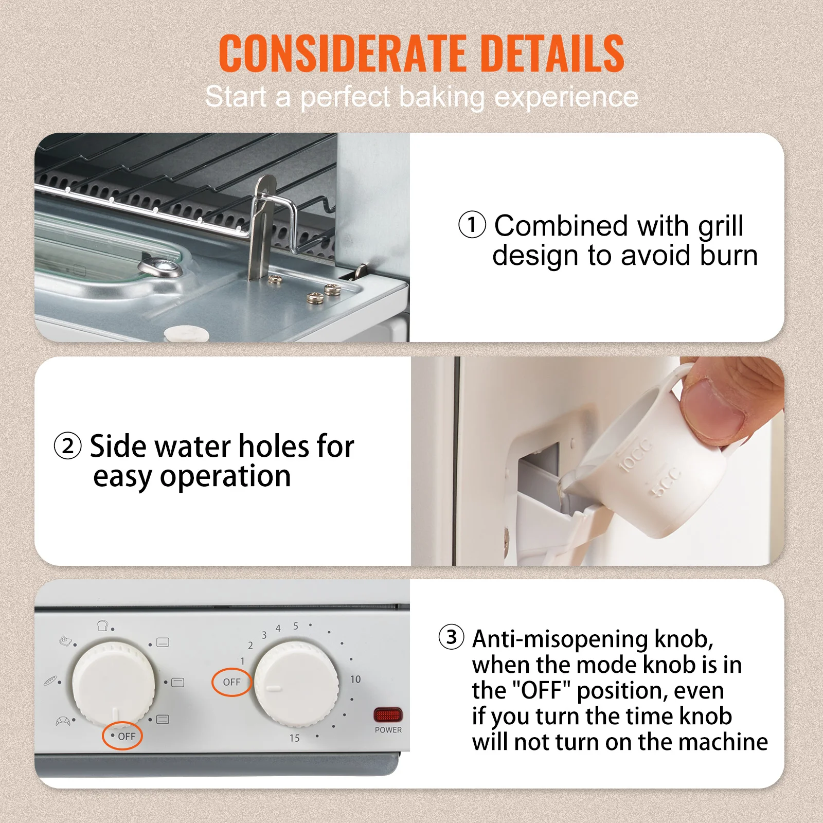 Thoughtful Details: Combined with the grill, it can bring out the grill when the oven door is pulled out, preventing burns on the handles; side water holes for easy operation; anti-misopening knob to avoid children from adjusting the time knob and accidentally open the machine.
