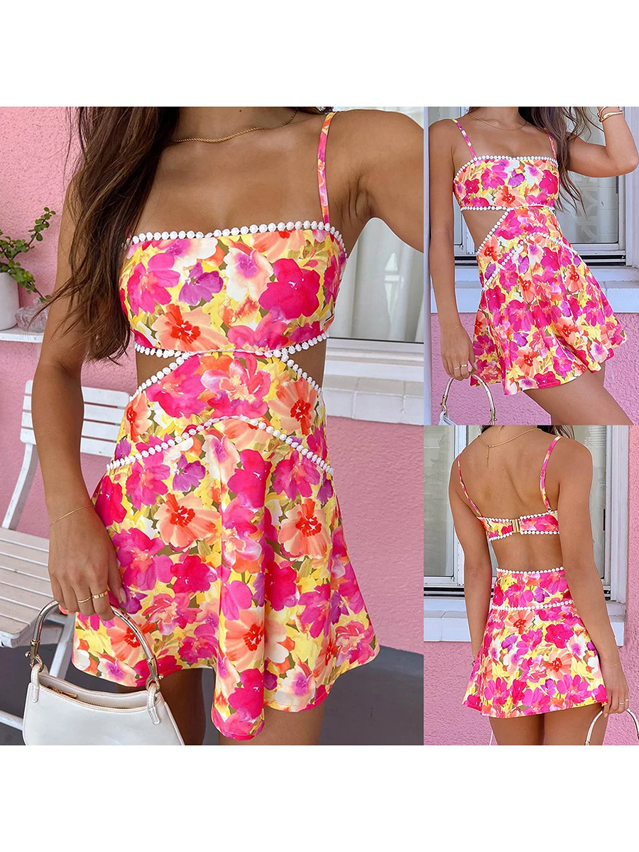Women’s Summer Mini Cami Dress Sleeveless Open Back Cutout Floral Spaghetti Strap Dress