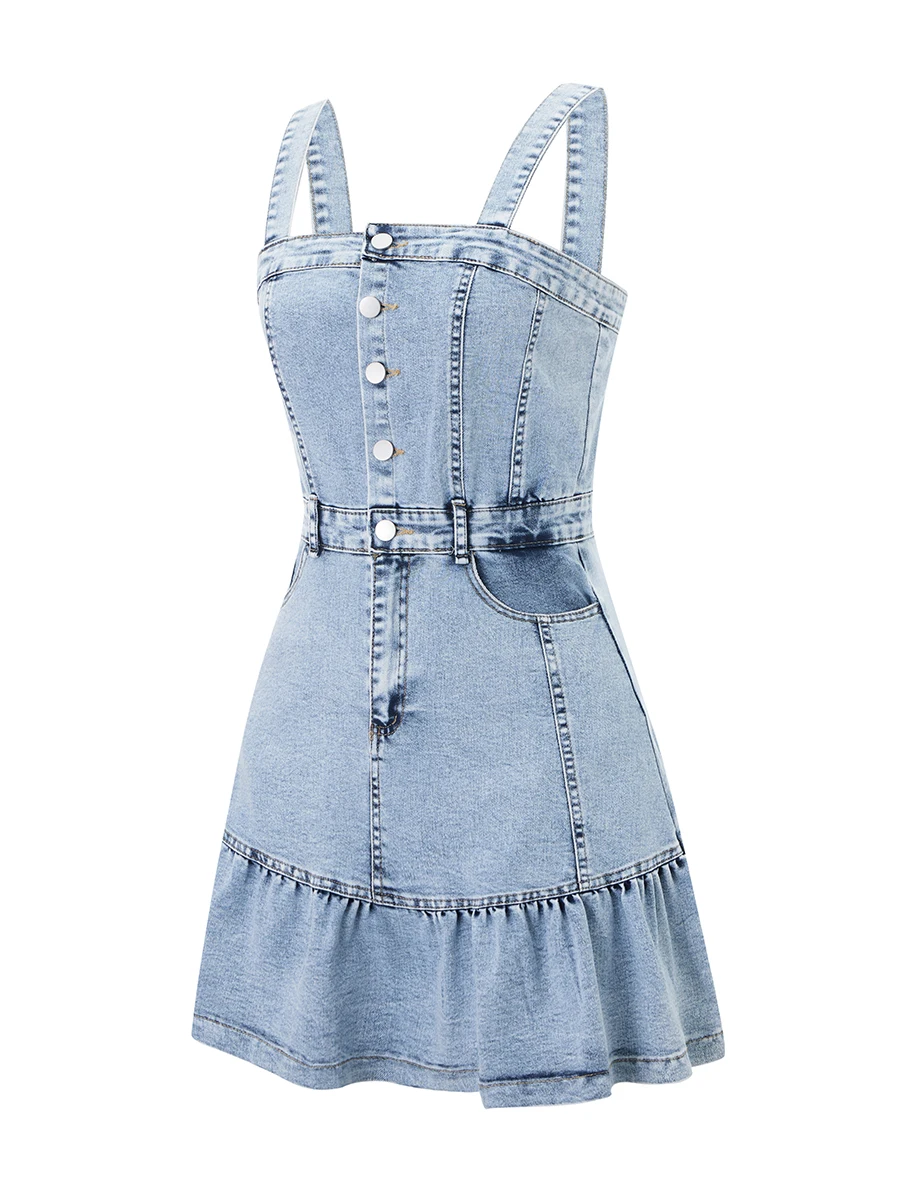 Women s Sleeveless Denim Jumpsuit with Button Up Front and Square Neckline Solid Color Overall Mini Dress for Summer Beachwear